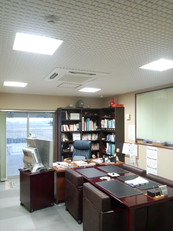 社長室、休憩所、事務所とLEDに入れ替えました。明るさにむらがなくなり手元の明るさも十分です。人と同じで会社も第一印象が大切です。会社の雰囲気も明るくなったのではないでしょうか。